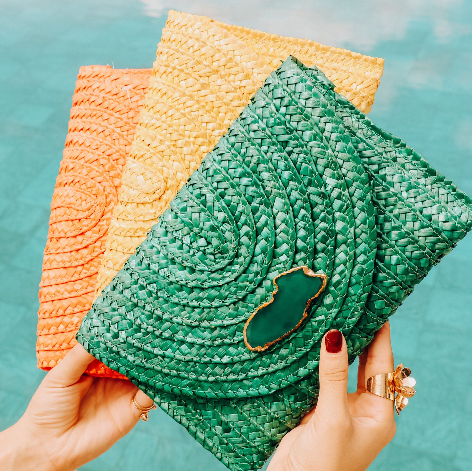 Bolsa de mão, modelo carteira Clutch envelope, de palha luxo. Essa clutch combina o charme rústico da palha natural com o toque sofisticado das pedras naturais – perfeita para destacar seu look com personalidade.