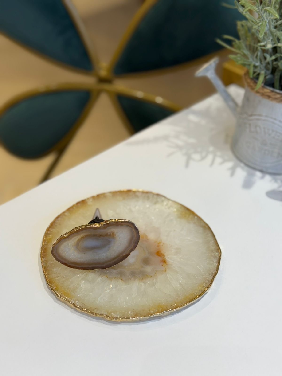 Leve charme e requinte à sua mesa com o nosso Platter e Stopper em Pedra Ágata Natural com banho em ouro 24 quilates.. Ideal para quem aprecia bons vinhos com estilo, esta peça combina funcionalidade e design sofisticado, sendo perfeita para ocasiões especiais ou para dar um toque decorativo ao bar ou à cozinha.