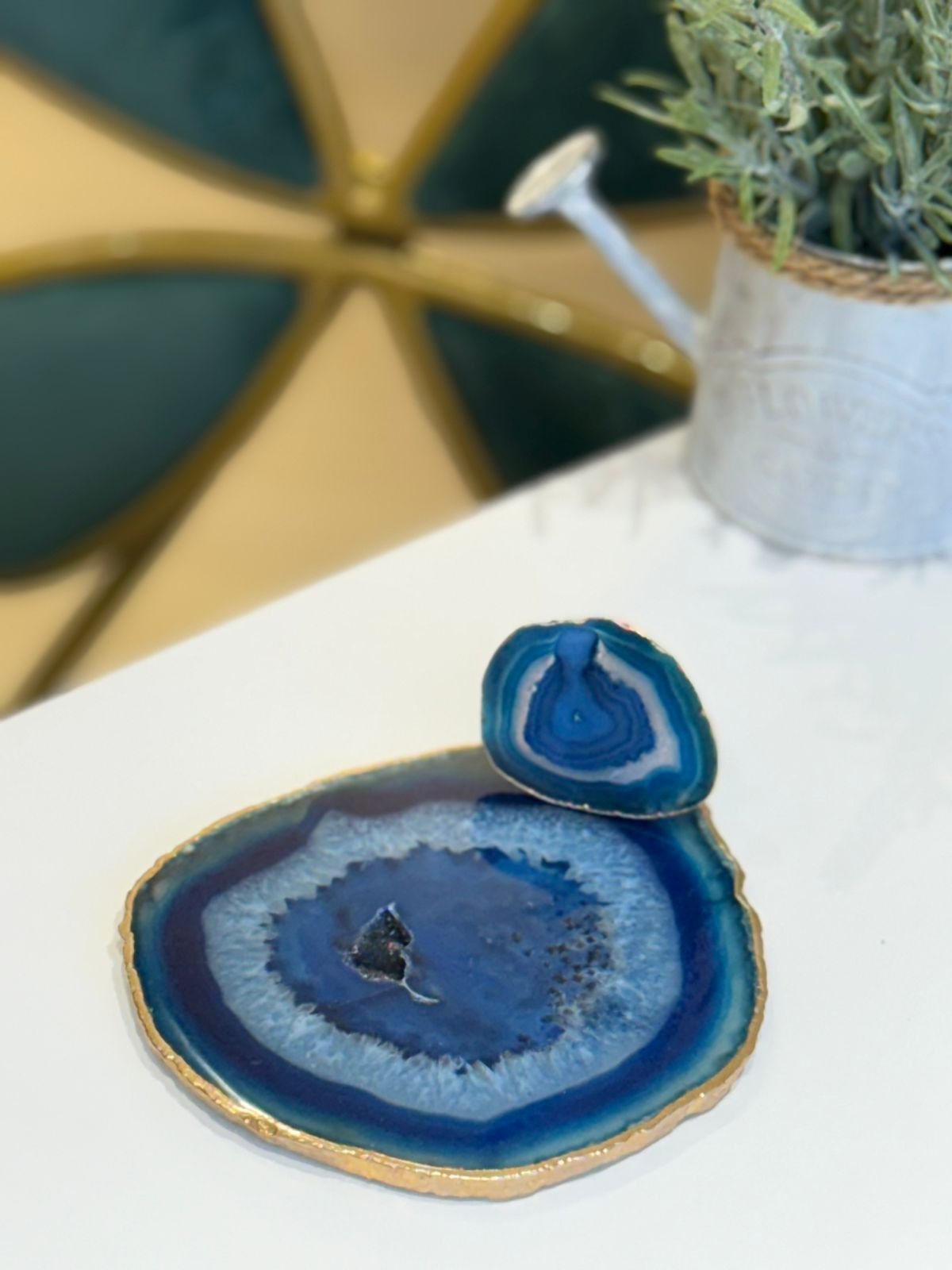 Leve charme e requinte à sua mesa com o nosso Platter e Stopper em Pedra Ágata Natural com banho em ouro 24 quilates.. Ideal para quem aprecia bons vinhos com estilo, esta peça combina funcionalidade e design sofisticado, sendo perfeita para ocasiões especiais ou para dar um toque decorativo ao bar ou à cozinha.