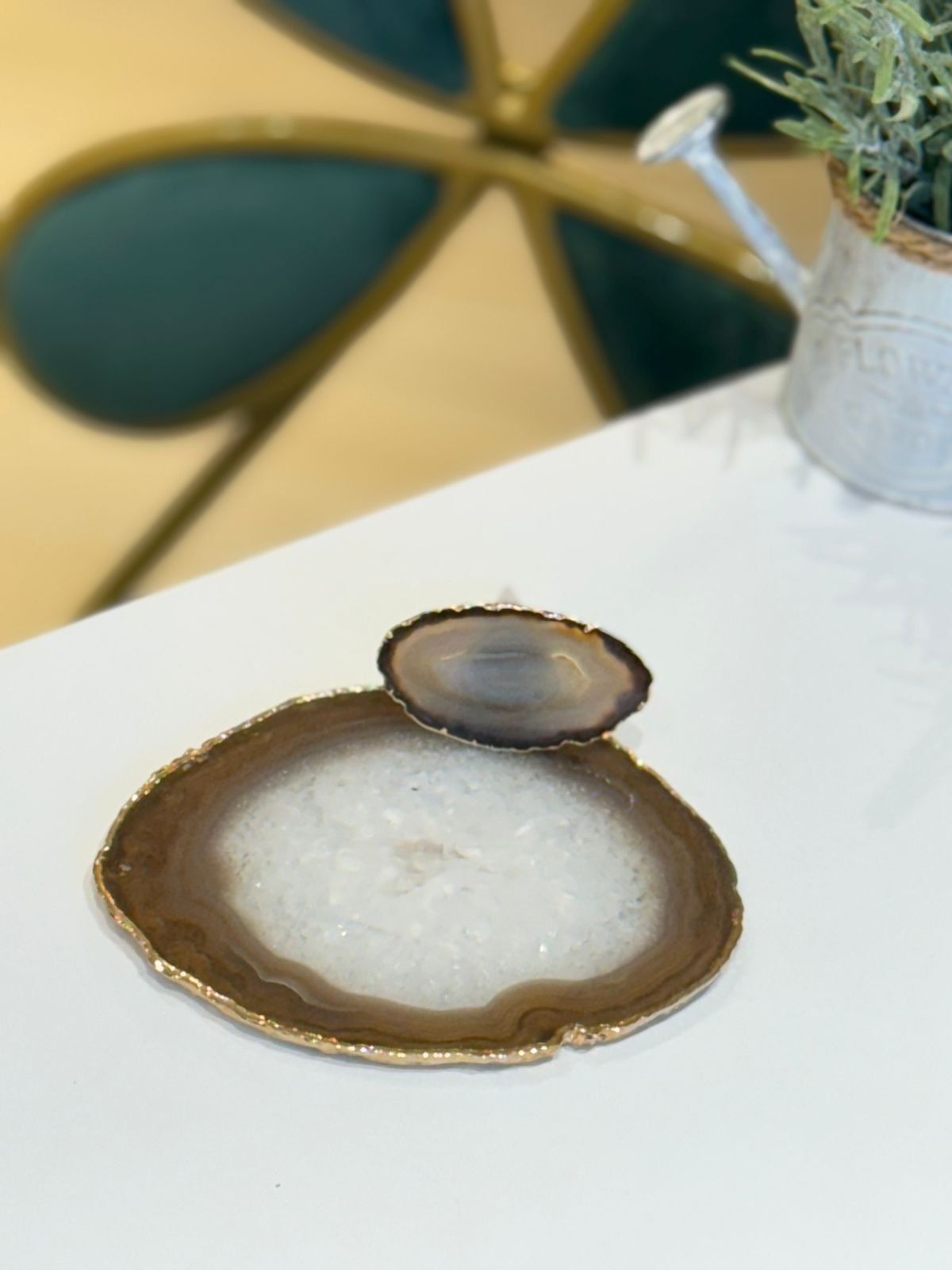 Leve charme e requinte à sua mesa com o nosso Platter e Stopper em Pedra Ágata Natural com banho em ouro 24 quilates.. Ideal para quem aprecia bons vinhos com estilo, esta peça combina funcionalidade e design sofisticado, sendo perfeita para ocasiões especiais ou para dar um toque decorativo ao bar ou à cozinha.
