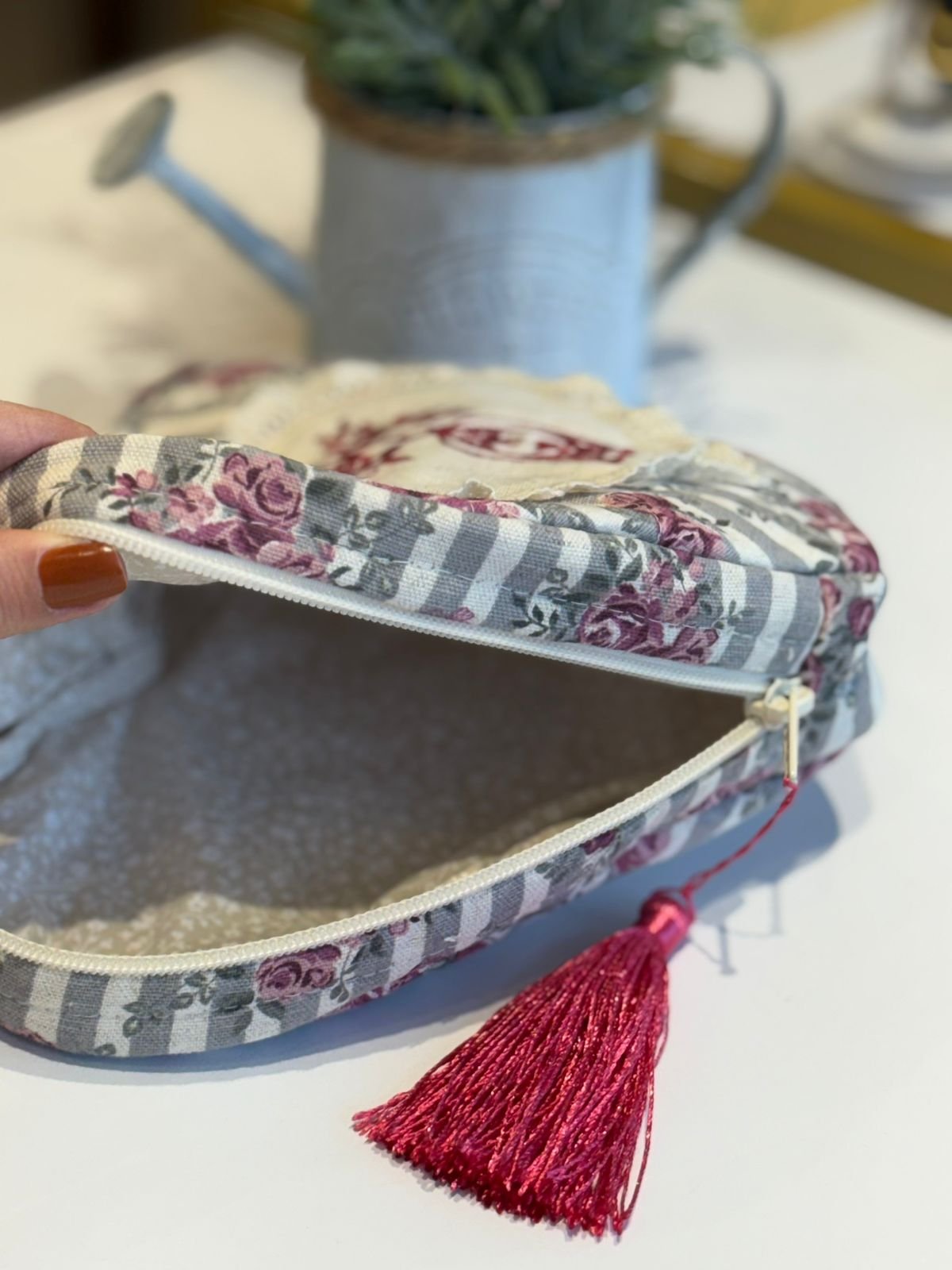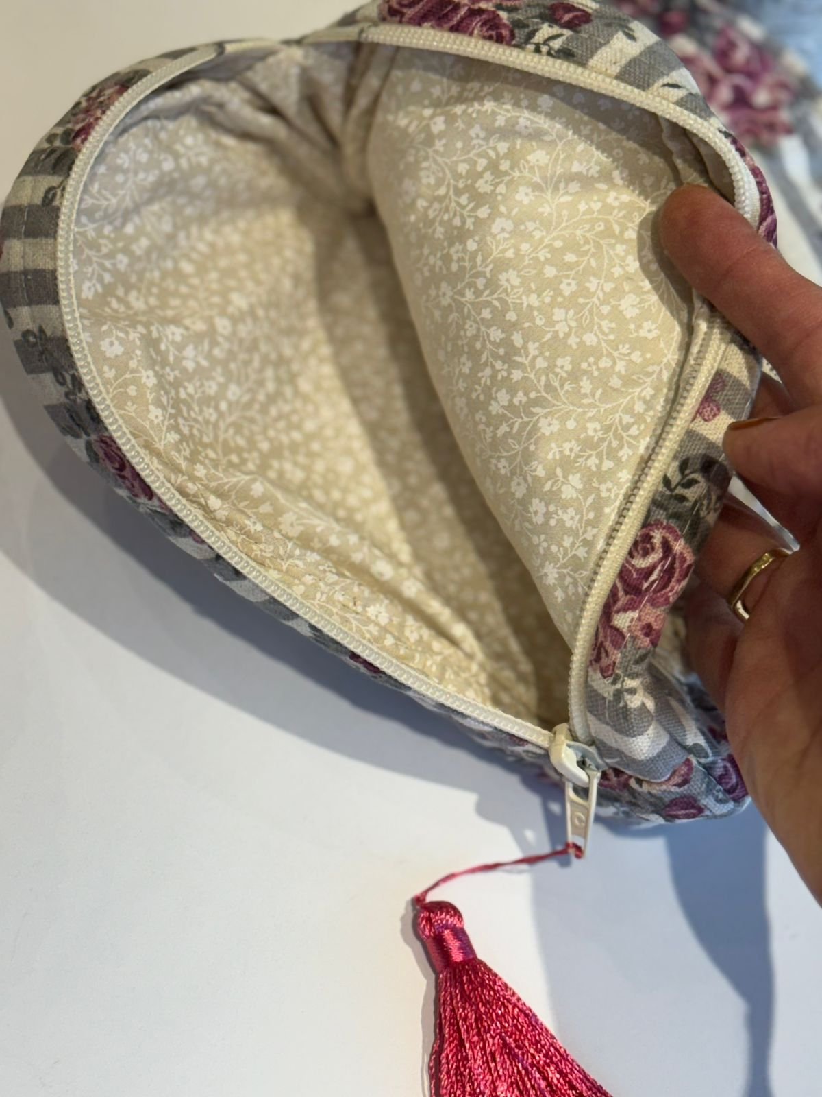 Necessaire Coração em Linho com Forro de Tricoline e Tassel de Seda – 22x20x5 cm