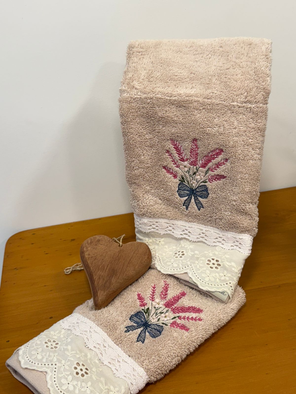 - Contém: 2 toalhas de lavabo + 1 coração de madeira