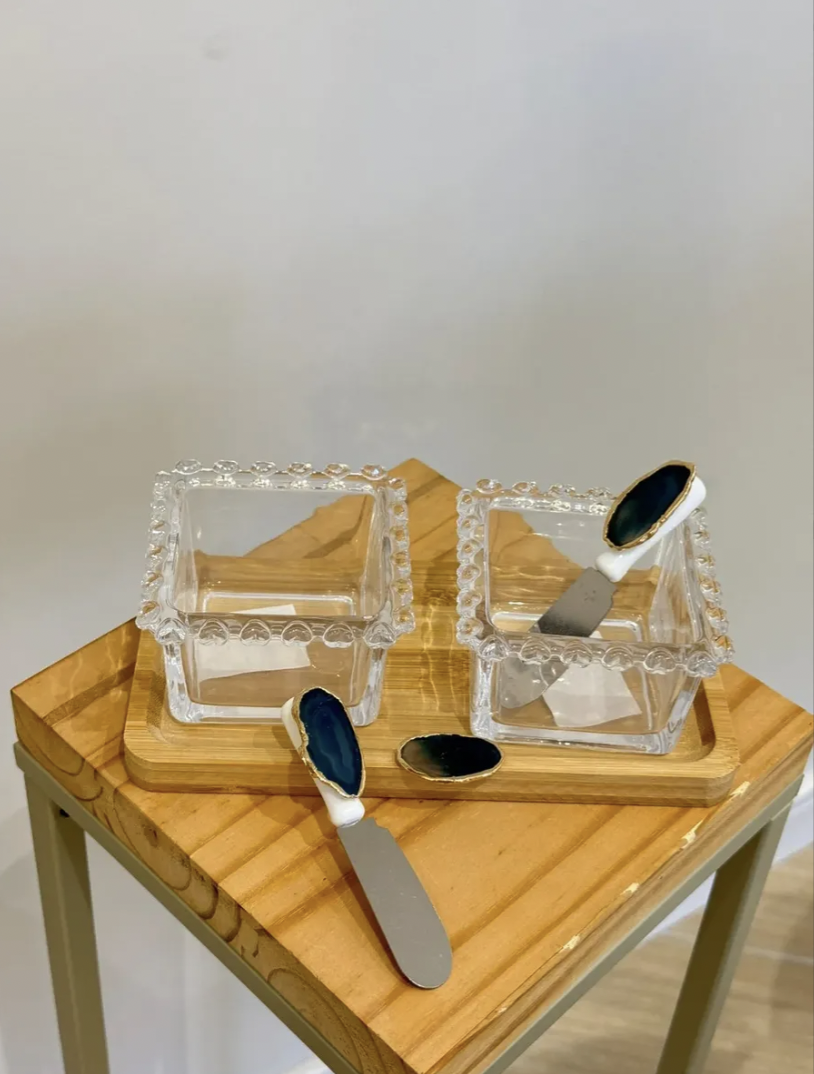 Petisqueira em Madeira com Potiches de Vidro, Espátulas e Ágata Azul – Charme e Funcionalidade em Cada Detalhe